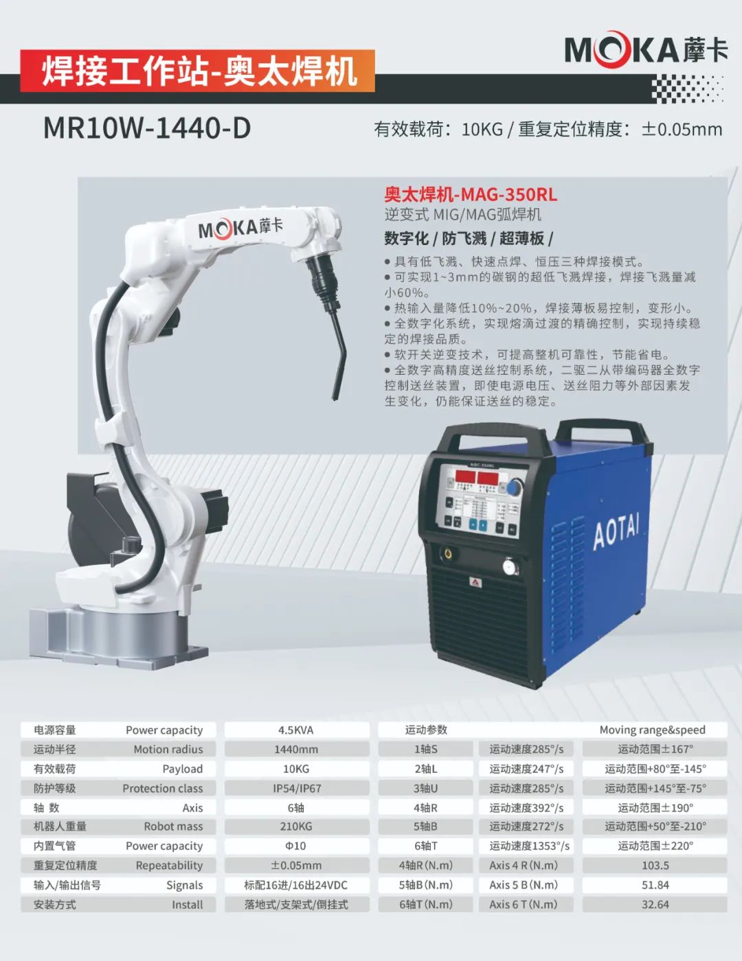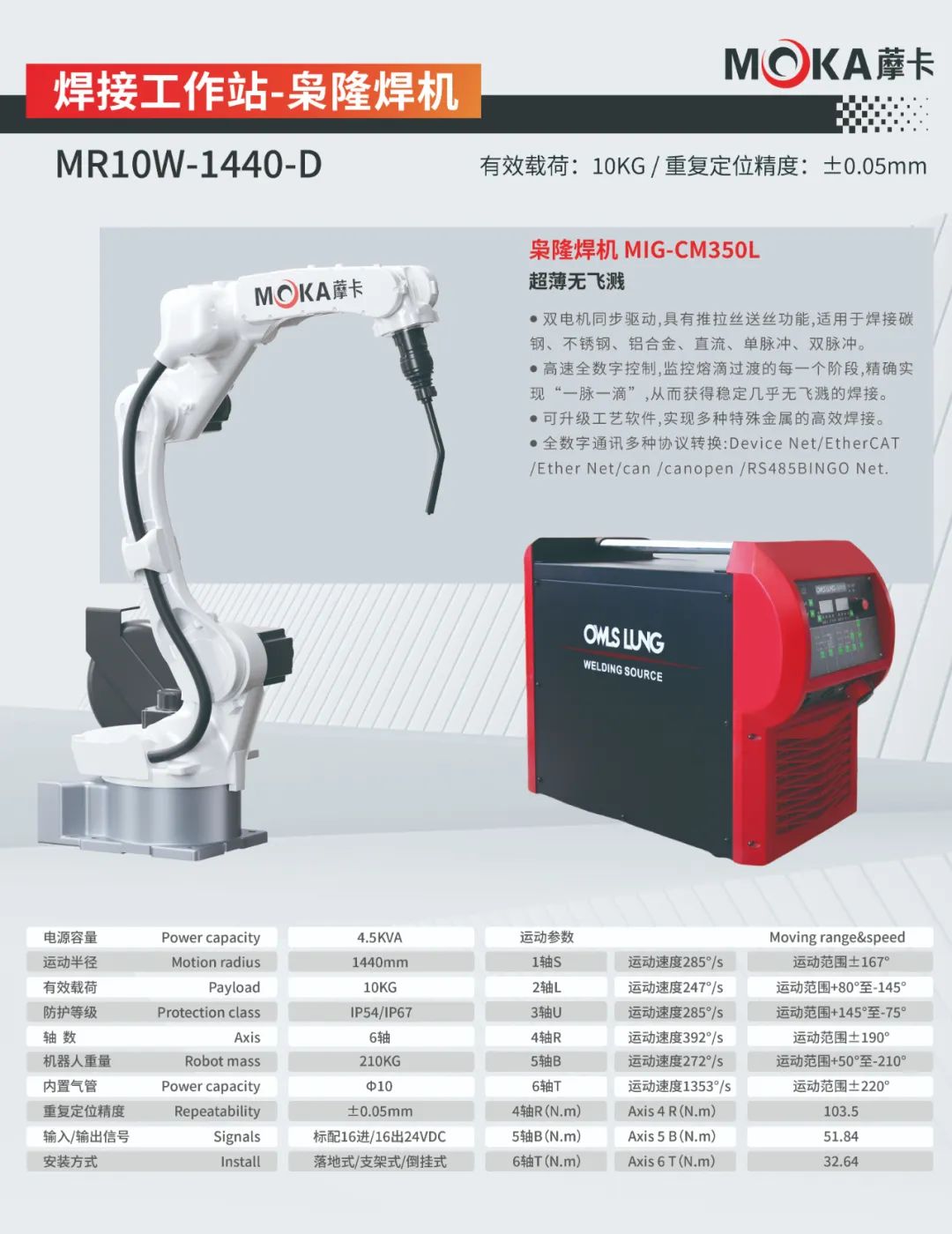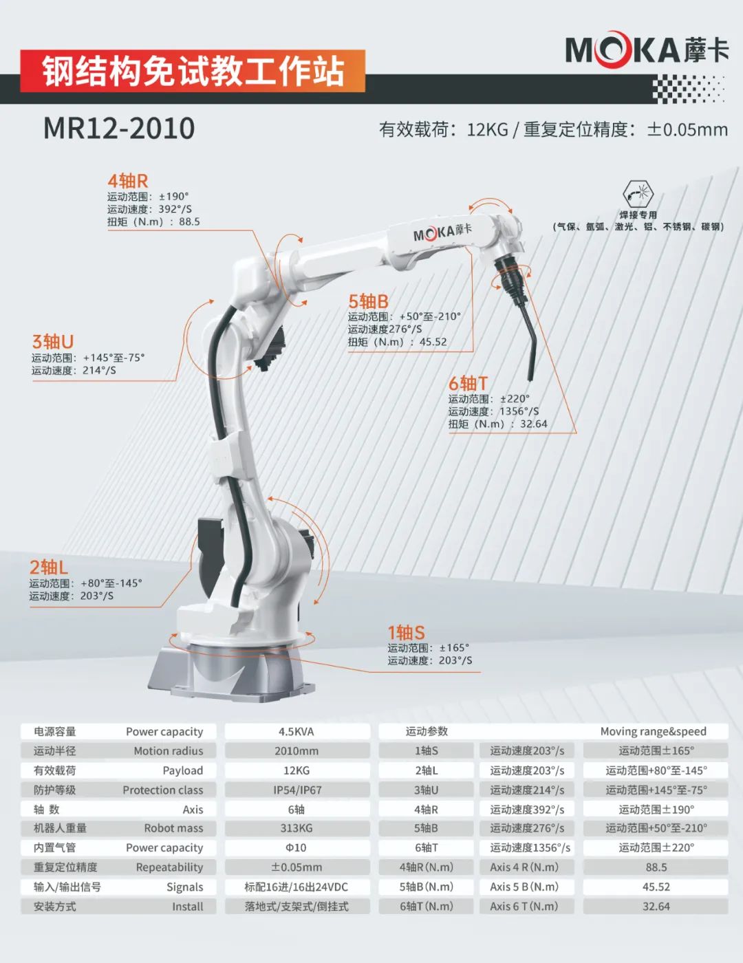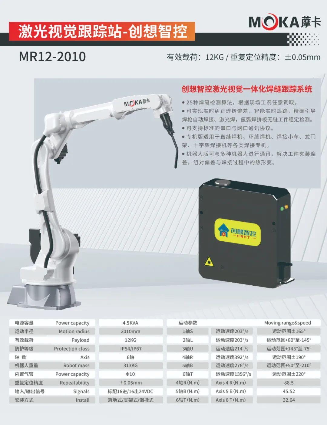 MR12-2010機(jī)器人重復(fù)定位精度可達(dá)±0.05mm,有效載荷為12kg,運(yùn)動(dòng)半徑達(dá)2010mm,是一款應(yīng)用于氣保、氬弧、激光、鋁、不銹鋼、碳鋼等領(lǐng)域的焊接專用機(jī)器人。
