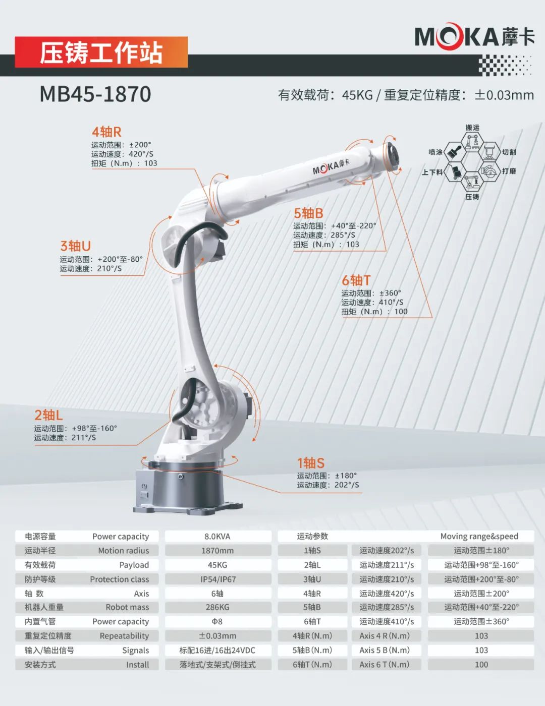 MB35-1870機(jī)器人重復(fù)定位精度達(dá)±0.03mm, 有效載荷35kg,運(yùn)動(dòng)半徑1870mm,適用于搬運(yùn)、噴涂、切割、上下料等應(yīng)用領(lǐng)域。