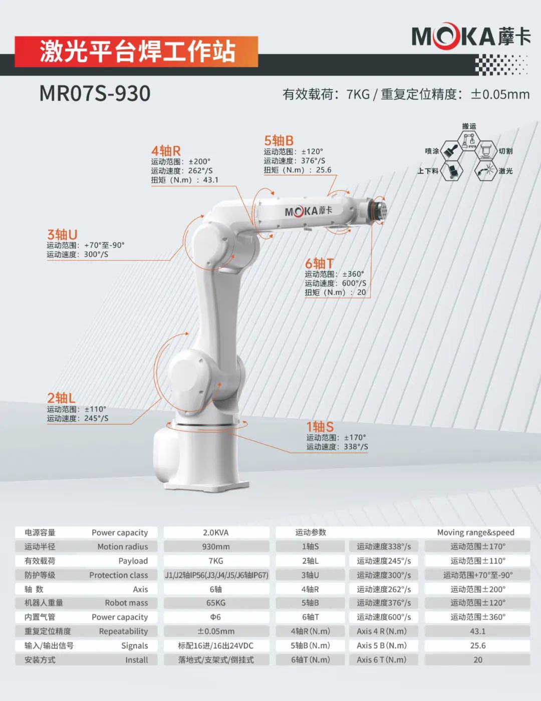 MR07S-930機(jī)器人重復(fù)定位精度達(dá)±0.05mm, 有效載荷7kg,運(yùn)動(dòng)半徑930mm,適用于上下料、噴涂、搬運(yùn)、切割等應(yīng)用領(lǐng)域。