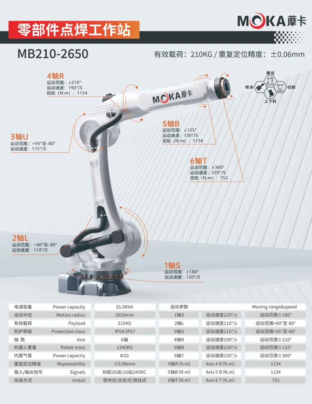 MB210-2650機(jī)器人重復(fù)定位精度可達(dá)±0.06mm,有效載荷為210kg,運(yùn)動(dòng)半徑達(dá)2650mm,是一款應(yīng)用于搬運(yùn)、噴涂、切割、上下料等領(lǐng)域的大負(fù)載機(jī)器人。