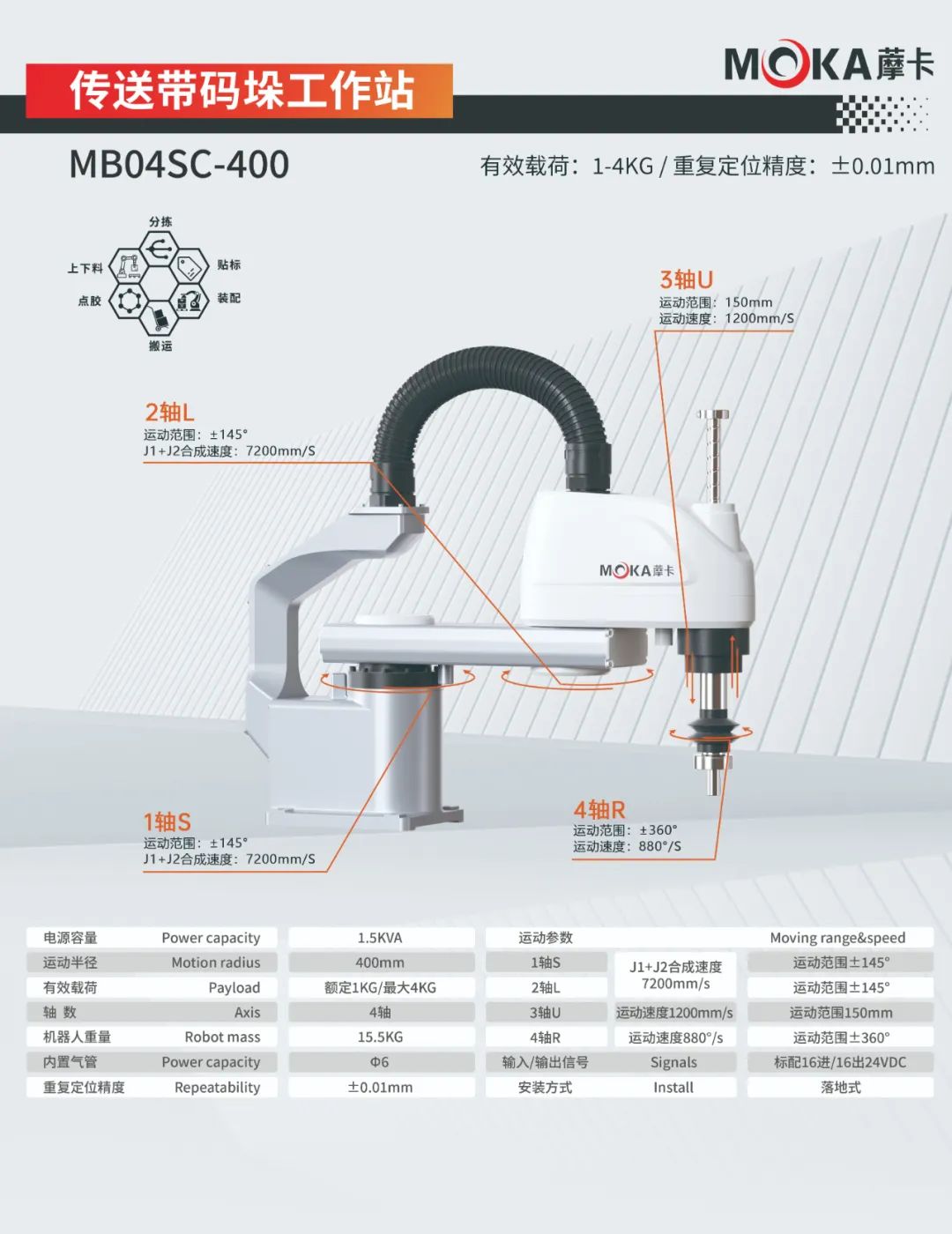 MB04SC-400機(jī)器人重復(fù)定位精度達(dá)±0.01mm, 有效載荷4kg,運(yùn)動(dòng)半徑400mm,適用于分揀、上下料、點(diǎn)膠、貼標(biāo)、裝配、搬運(yùn)等應(yīng)用領(lǐng)域。